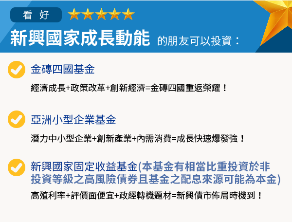 | 由於新興市場基金之主要投資風險除包含一般股票型基金之投資組合跌價與匯率風險外,與成熟市場相比須承受較高之政治與金融管理風險,而因市值及制度性因素,流動性風險也相對較高,新興市場投資組合波動性普遍高於成熟市場。基金投資均涉及風險且不負任何抵抗投資虧損之擔保。投資風險之詳細資料請參閱基金公開說明書。 |