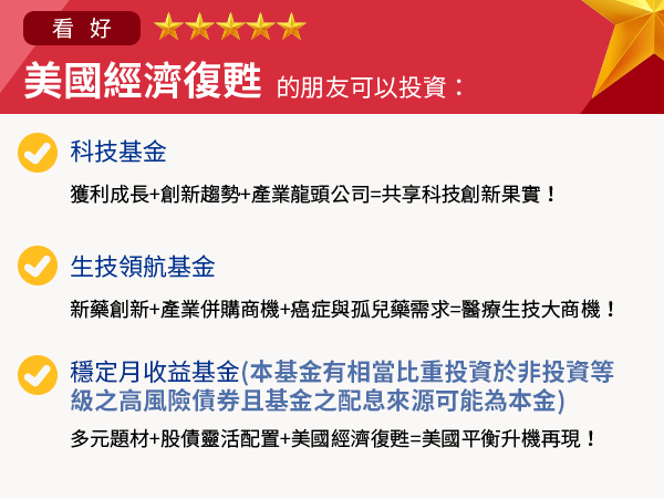 | 本境外基金經金融監督管理委員會核准或申報生效在國內募集及銷售,惟不表示絕無風險。基金經理公司以往之經理績效不保證基金之最低投資收益;基金經理公司除盡善良管理人之注意義務外,不負責本基金之盈虧,亦不保證最低之收益,投資人申購前應詳閱基金公開說明書。 |
