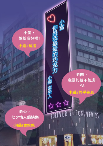 告訴小編你想跟誰說話,小編讓你在台北東區10層樓電視牆霸氣告白,而且輕鬆領取紅利點數817點(1點抵1元手續費)!