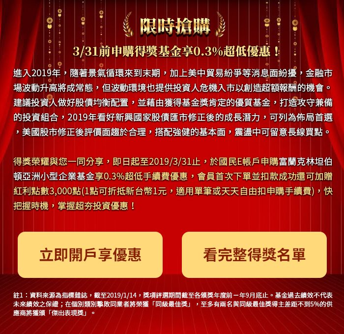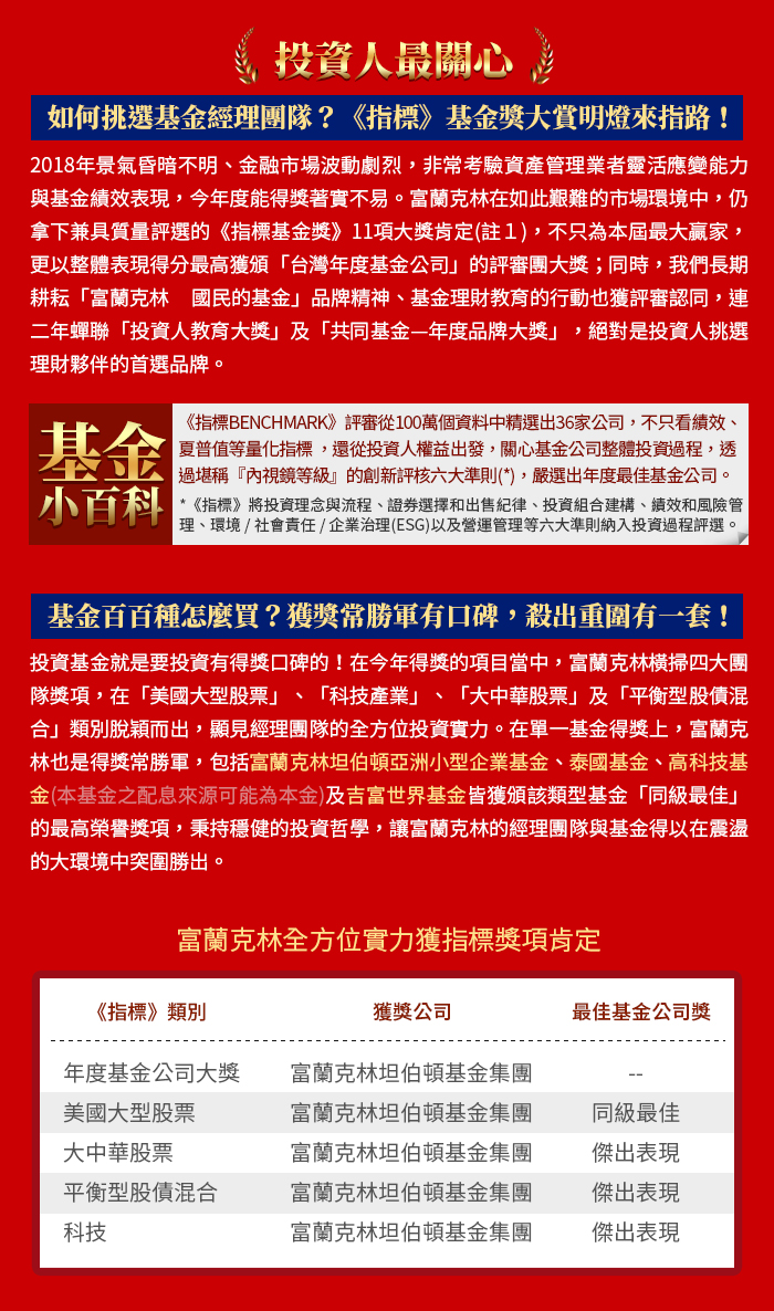 | 投資基金所承擔之相關風險及應負擔之費用(含分銷費用)已揭露於基金公開說明書及投資人須知中,投資人可至境外基金資訊觀測站( http://www.fundclear.com.tw )下載,或逕向本公司網站 ( http://www.Franklin.com.tw )查閱。 |