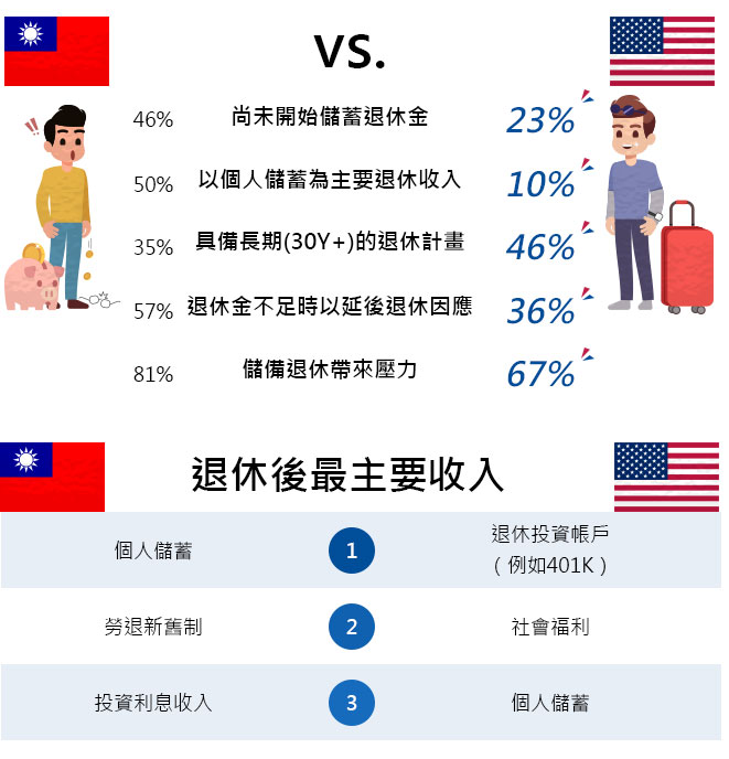 | 比較台灣與美國的退休調查結果,我們發現美國人的各項退休準備情況都優於台灣人!差異在於美國多數勞工為了爭取免稅優惠,會參加政府的退休福利計劃,參加者須提撥部分薪資,用於投資下列自選標的,如:基金、股票、年金保險、債券、專項定期存款等,可見退休準備的「投資工具」選擇很重要! | |