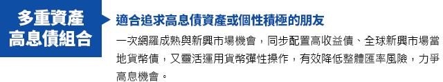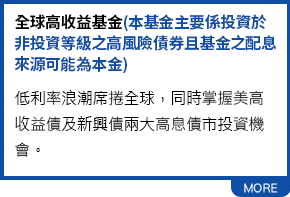 由於高收益債券之信用評等未達投資等級或未經信用評等,且對利率變動的敏感度甚高,故本基金可能會因利率上升、市場流動性下降,或債券發行機構違約不支付本金、利息或破產而蒙受虧損。本基金不適合無法承擔相關風險之投資人。基金經理公司以往之經理績效不保證基金之最低投資收益;基金經理公司除盡善良管理人之注意義務外,不負責本基金之盈虧,亦不保證最低之收益,投資人申購前應詳閱基金公開說明書。本基金較適合投資屬性中風險承受度較高之投資人,投資人投資高收益債券為訴求基金不宜占其投資組合過高之比重,投資人應審慎評估。