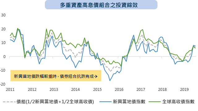 將近10年的績效試算結果顯示,當新興當地債市表現承壓時,債券組合會展現抗跌效果,甚至長期績效平均並不遜色於單一特性債券,可見債券組合具備更追漲抗跌的特性。