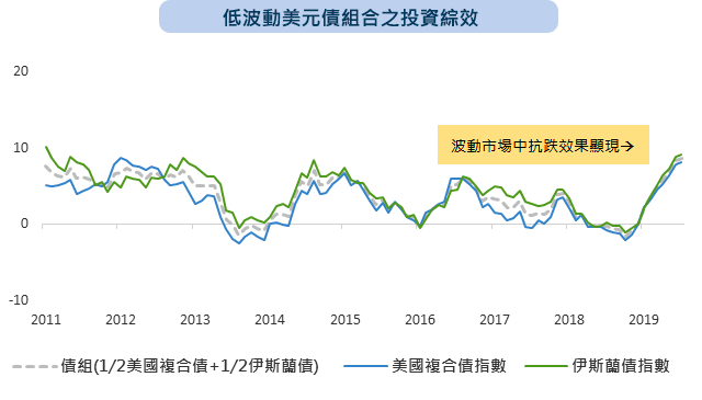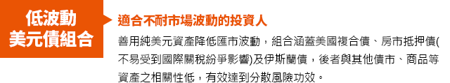 今年以來市場震盪較大,低波動美元債組合的兩檔基金展現極佳抗震特性,風險承受能力有限的投資人可透過此債券組合,加強防範市場風險。