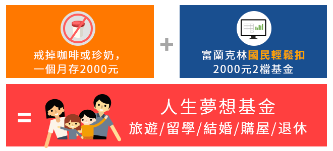 | | 其實只要戒掉「拿鐵因子」,每個月至少能輕鬆存到2000元,再搭配富蘭克林新手入門的首選《國民輕鬆扣》方案,運用超低投資門檻加超殺手續費優惠,並堅持定期定額、長期投資、停利不停扣,加上時間複利的效果,無痛存金不是夢! | |