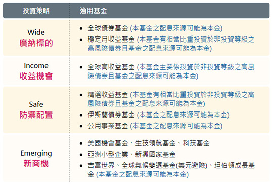 高收益債券基金警語:由於高收益債券之信用評等未達投資等級或未經信用評等,且對利率變動的敏感度甚高,故本基金可能會因利率上升、市場流動性下降,或債券發行機構違約不支付本金、利息或破產而蒙受虧損。本基金不適合無法承擔相關風險之投資人。本基金較適合投資屬性中風險承受度較高之投資人,投資人投資以高收益債券為訴求之基金不宜占其投資組合過高之比重,投資人應審慎評估。