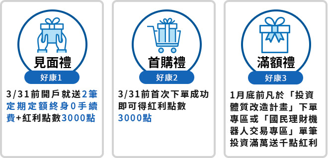 ‧見面禮2筆定期定額終身0元優惠於開戶且核印成功隔日匯入,優惠匯入後隔日起算60天內(含假日)需下單完成,不限基金;見面禮、首購禮與滿額禮紅利點數自匯入隔日起一年有效。