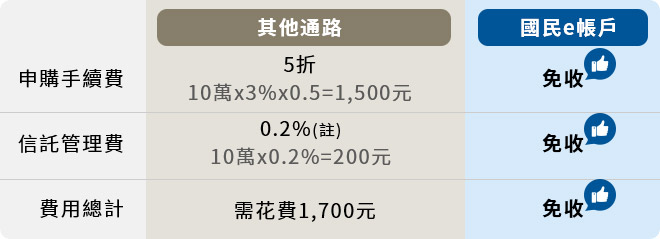 *以上試算以單筆新台幣10萬元,並依境外基金之股票及平衡型基金牌告手續費率為3%舉例。