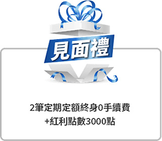 資料來源:見面禮2筆定期定額終身0元優惠於開戶完成且核印成功隔日匯入,優惠匯入後隔日起算60天內(含假日)需下單完成,不限基金,紅利點數使用期限一年(含假日);首購禮紅利點數一年有效。