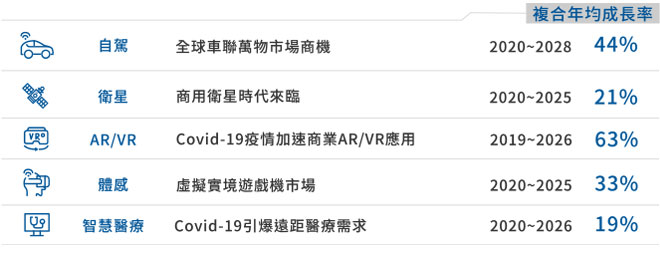 資料來源:Markets and Markets TM, AUTOMOTIVE V2X MARKET : marketwatch.com, Aug. 21, Market Study Report Apr, 2020 ; Research and Markets, Jul. 22, 2020 : Global Market insight, Apr 2020,富蘭克林華美投信整理。