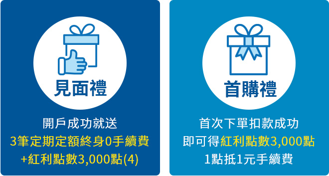 (3)基金平均規模資料取自理柏資訊,時間為截至2021/2/28,單位為億美元。基金平均成立時間取自理柏資訊,資料更新時間為2021/4/13,以年為單位。平均經理費率為彭博資訊之最新時點資料(%)資料更新時間為2021/4/13,顯示無則表示彭博無該資訊。台灣核備境外基金不含貨幣型基金共996檔。(4)見面禮3筆定期定額終身0元手續費優惠於開戶且核印成功隔日匯入,優惠匯入後隔日起算60天內(含假日)需下單完成,不限基金,紅利點數使用期限一年(含假日);首購禮紅利點數一年有效。