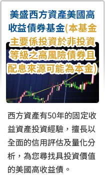 由於高收益債券之信用評等未達投資等級或未經信用評等,且對利率變動的敏感度甚高,故本基金可能會因利率上升、市場流動性下降,或債券發行機構違約不支付本金、利息或破產而蒙受虧損。本基金不適合無法承擔相關風險之投資人。基金經理公司以往之經理績效不保證基金之最低投資收益;基金經理公司除盡善良管理人之注意義務外,不負責本基金之盈虧,亦不保證最低之收益,投資人申購前應詳閱基金公開說明書。本基金較適合投資屬性中風險承受度較高之投資人,投資人投資高收益債券為訴求基金不宜占其投資組合過高之比重,投資人應審慎評估。