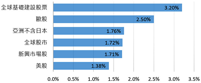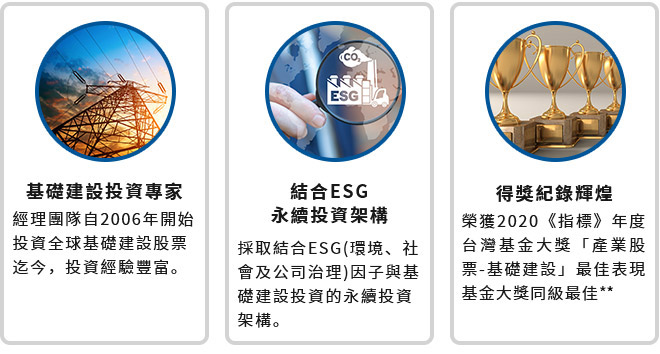 | | 近來國內面臨缺水危機,同時也出現停電的突發狀況,讓人意識到基礎建設的重要性,從投資層面來看,全球基礎建設類股擁有三大利基優勢,適合作為長期配置的一環。 | | | | | | | 利基一、受惠於經濟重啟,今年基礎建設股票獲利成長強勁 | | | | | 除了電力等公用事業之外,基礎建設產業也涵蓋鐵路、公路及機場(簡稱鐵公機)等使用者付費資產,在經濟成長帶動通膨上揚的環境下,獲利通常可以受惠而上揚。 | | | | | | 史坦普基礎建設指數年度每股盈餘(EPS)預估(美元) | | | | | | | | | 利基二、環保減碳+政策作多,全球基建長線商機上看70兆 | | | | | 已開發國家多數正面臨基礎建設老舊或高齡化人口增加而必須升級、提高承載量及永續經營的挑戰,新興國家在人口成長及城市化發展下也必須大舉投入新的基礎建設,需要政府與民間資金共同投資,共同締造基礎建設產業長期成長趨勢。 | | | | 全球基礎建設類股相對全球股市評價面低於十年平均*,同時具備較高股利率優勢,適合滿手成長股的投資人納入作為資產配置的一環。 | | | | 結合ESG投資的全球基礎建設基金,替您強化資產免疫力 美盛凱利基礎建設價值基金(更名前: 美盛睿安基礎建設價值基金*)(本基金之配息來源可能為本金) | | | | 資料來源: 富蘭克林坦伯頓基金集團,凱利投資。*本基金自2020年6月29日起更名。**指標雜誌,截至2021/01/11,獎項評選期間截至各頒獎年度前一年9月底止,在個別類別擊敗同業者將榮獲「同級最佳獎」。 | | | |