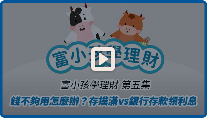 【富小孩學理財】第五集影片上線了!這次牛寶不小心弄壞了爸爸的眼鏡,想要幫爸爸買一支新的,可是身為小孩的牛寶沒有錢,該怎麼辦呢?牛媽媽靈機一動,想藉此機會讓牛寶體驗賺錢的辛苦,並且了解儲蓄的重要性。想知道牛寶最後有到足存夠錢嗎?他是否能了解「存錢」的意義?還有把錢存到銀行有什麼好處呢?馬上觀看影音,跟著牛寶一起朝富小孩邁進吧!