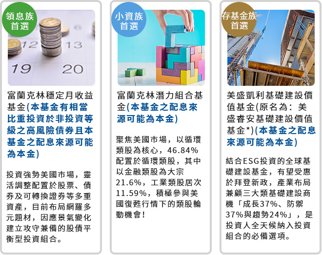 基金的配息可能由基金的收益或本金中支付。任何涉及由本金支出的部份,可能導致原始投資金額減損。部份基金進行配息前未先扣除應負擔之費用。由本金支付配息之相關資料已揭露於本公司網站,投資人可至本公司網站(