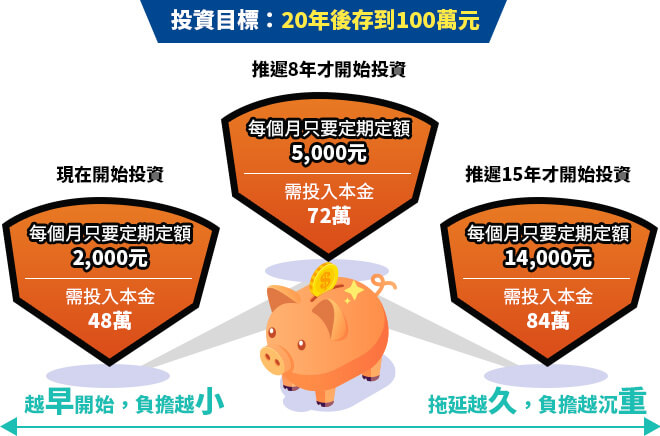 數據會說話,以20年後存到100萬元為投資目標,現在開始投資,每個月只要輕鬆負擔2,000元,倘若財務狀況允許,願意將每月定期定額金額提高至5,000元,甚至還能縮短達成投資目標的時間。但千萬不要延遲過久才開始投資,假設推遲15年才開始,每個月的負擔會較大,而且需投入本金也差近一半,所以聰明的投資人都一定要學會運用時間複利