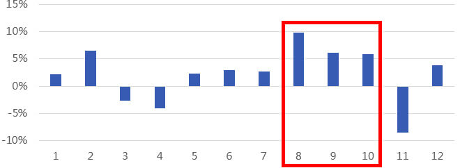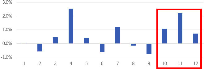 統計過去20年史坦普指數的每月波動幅度及漲跌幅,可發現第三季向來為市場波動較大的時期,但只要耐心等待傳統旺季的來臨,第四季通常都會有不錯的反轉行情,平均有0.7%~2.2%的月漲幅機會。