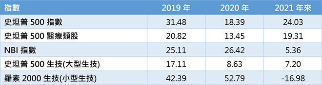 疫情期間,美股有科技、生技股等主流趨勢撐場,遞出亮眼成績單,但近期生技股因政策不確定性促使資金觀望、個股試驗數據錯綜,以及企業併購動能降溫等多重因素,導致表現不如大盤,今年以來NBI生技指數僅上漲5.36%,不如史坦普500指數24.03%的漲幅,前兩年漲勢突出的中小型生技股表現也相對黯淡。