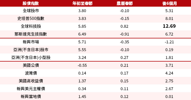 追蹤過去5五年農曆春節期間全球股債市表現,觀察到年初至農曆春節期間全球股債市表現普遍強勁,反應元月行情效應仍相當顯著,而農曆春節期間雖偶有震盪,但之後6個月仍有上揚表現,投資人其實