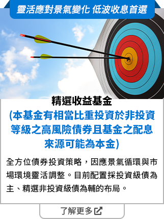 由於高收益債券之信用評等未達投資等級或未經信用評等,且對利率變動的敏感度甚高,故本基金可能會因利率上升、市場流動性下降,或債券發行機構違約不支付本金、利息或破產而蒙受虧損。本基金不適合無法承擔相關風險之投資人。基金經理公司以往之經理績效不保證基金之最低投資收益;基金經理公司除盡善良管理人之注意義務外,不負責本基金之盈虧,亦不保證最低之收益,投資人申購前應詳閱基金公開說明書。本基金較適合投資屬性中風險承受度較高之投資人,投資人投資高收益債券為訴求基金不宜占其投資組合過高之比重,投資人應審慎評估。