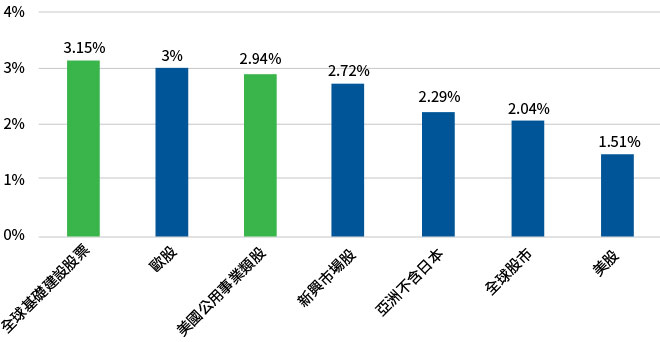 資料來源: 彭博資訊,截至2022年4月底,取史坦普全球基礎建設股價指數、史坦普公用事業類股指數、史坦普500指數、MSCI股價指數,美元計價。股利率不代表本基金之配息率。