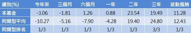 ,在同類型平衡基金中,今年來表現相對抗跌,波動風險亦低於同類型平均,適合想要穩健報酬、安心成長的投資人納入資產組合中!