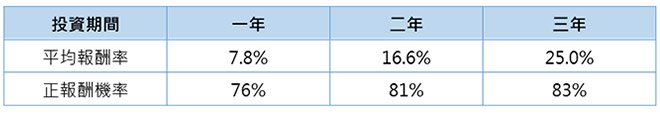 根據統計數據顯示,任一個月進場投資MSCI世界資訊科技指數達1年,平均報酬率達7.8%,且隨著時間拉長,正報酬機率跟平均報酬率同樣隨之拉高,顯示不論市場跌宕,紀律投資就能微笑收割!