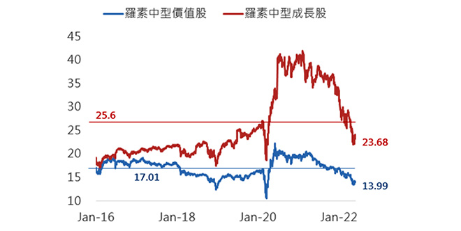 價值股和成長股在評價上均已降至近5年平均之下,但價值股的本益比仍遠低於成長股且較疫情爆發前幾年低,儘管成長股的本益比下滑,但與疫情前幾年相比仍相對偏高。