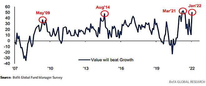 根據6月份的美銀美林經理人調查,淨65%的經理人預期價值股表現將優於成長股,比例為調查以來最高,且較上個月大幅增加17個百分點。