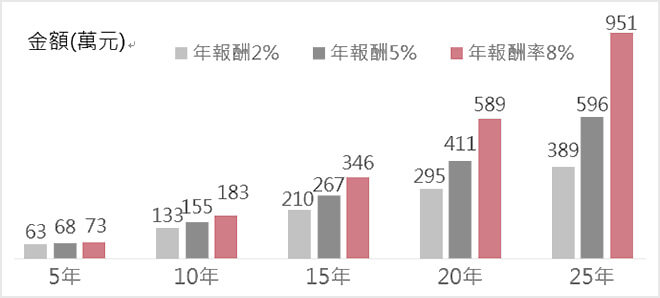 由上圖可知,報酬率太低時,複利效果並不明顯。以投資25年來看,投資本金為300萬,年報酬率2%時,累積資產僅有389萬,當年報酬率拉高至5%~8%,累積資產則大幅拉升至596萬~951萬,就有相當顯著的財富累積效果。