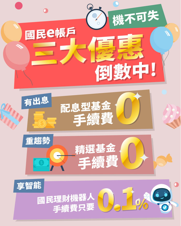 活動期間針對【國民理財機器人1號-富智能】或【國民理財機器人2號-富動能】進行「新申購投資計劃」或「原投資計劃單筆或定期定額新加碼」,手續費均享1折優惠,只要0.1%(原費率1%),不限下單次數。