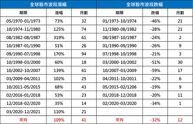觀察全球股市走勢,長期趨勢呈現向上,而且為短空長多,以1970年11月~2021年12月來看,