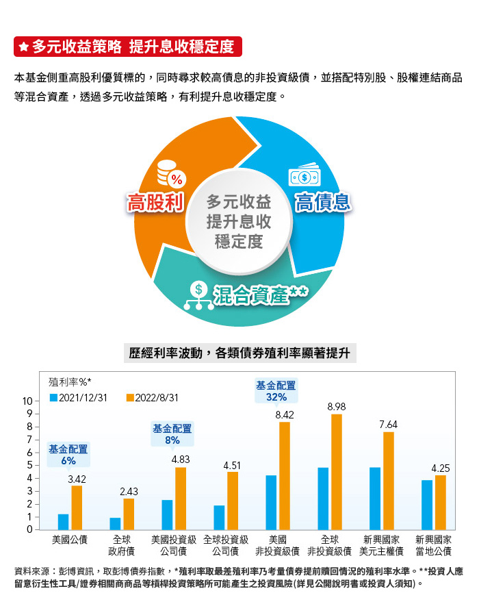 由於非投資等級債券之信用評等未達投資等級或未經信用評等,且對利率變動的敏感度甚高,故本基金可能會因利率上升、市場流動性下降,或債券發行機構違約不支付本金、利息或破產而蒙受虧損。本基金不適合無法承擔相關風險之投資人。基金經理公司以往之經理績效不保證基金之最低投資收益;基金經理公司除盡善良管理人之注意義務外,不負責本基金之盈虧,亦不保證最低之收益,投資人申購前應詳閱基金公開說明書。本基金較適合投資屬性中風險承受度較高之投資人,投資人投資非投資等級債券為訴求基金不宜占其投資組合過高之比重,投資人應審慎評估。