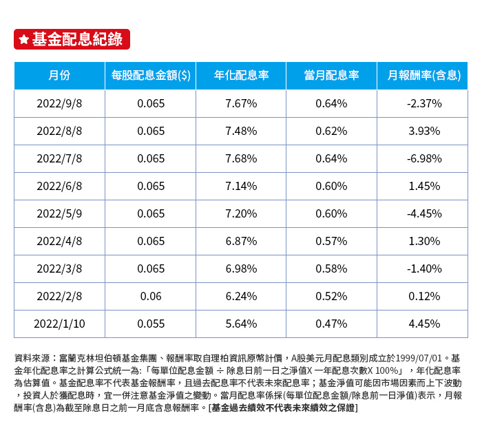 )查閱。基金配息率不代表基金報酬率,且過去配息率不代表未來配息率;基金淨值可能因市場因素而上下波動,投資人於獲配息時,宜一併注意基金淨值之變動。