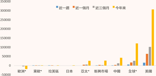 資料來源: 彭博資訊,資料時間2022/11/14 8am,統計彭博資訊可查詢之所有ETF資金流量。*全球:國際+全球股票型ETF,歐洲:歐元區+歐盟+歐洲不含英國+歐洲地區ETF,亞太:亞太+亞太(不含日本)+香港+南韓ETF。單位:百萬美元。