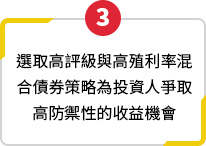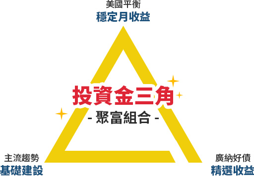 透過「一平衡、一債、一股」的金三角配置,以美國平衡型為核心,搭配具防禦性質、高股利低波特性的基礎建設產業、精選收益來源的複合債,不僅掌握債券殖利率上揚後的收益機會,更能分享多元收益,靈活應對通膨及經濟的不確定性!