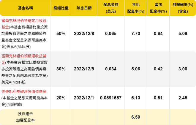 投資組合之配息率,採各組合之基金配比進行計算,計算資料採2023年1月當月年化配息率。後續配息率仍視實際收到股息收益及評估未來市場狀況以決定當期配息水準,惟配息發放並非保證,配息金額並非不變,亦不保證配息率水準。