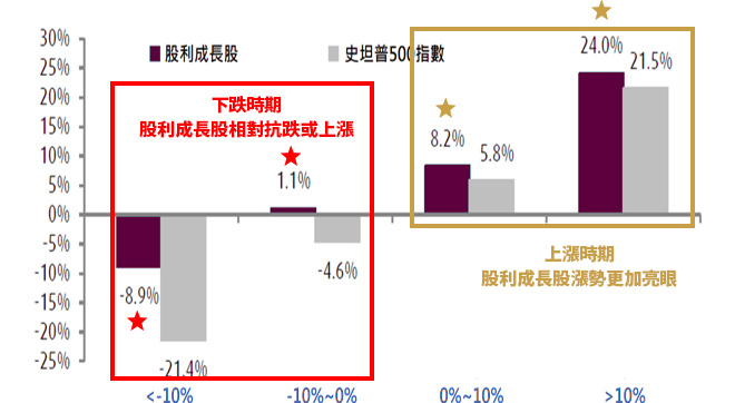 統計過去32年來,不論上漲或下跌時期,股利成長股皆較史坦普500指數有更好的表現。