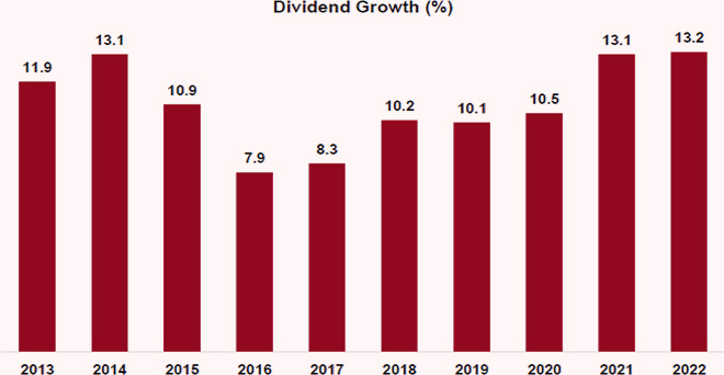 資料來源:富蘭克林坦伯頓基金集團,過去十年至2022年底。圖表顯示每年年底持有的投資組合加權平均一年股利成長率。股利的發放並沒有保障,增加、減少甚至是停發都是可能出現的狀況。