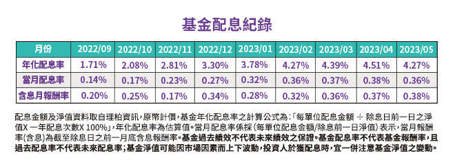 基金配息率不代表基金報酬率,且過去配息率不代表未來配息率;基金淨值可能因市場因素而上下波動,投資人於獲配息時,宜一併注意基金淨值之變動。