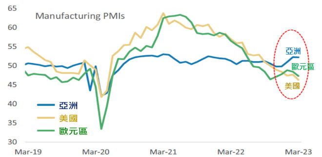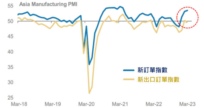 相較美國與歐元區製造業PMI仍處於擴張點之下,亞洲製造業不僅處於擴張點之上且有持續改善趨勢,其中,反應國內需求的「新訂單指數」為擴張狀態,突顯亞洲國家目前仍以本地需求為重。