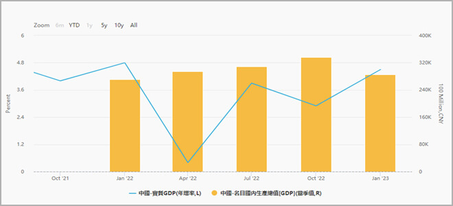 中國2023年第一季GDP年增率由2.9%回升至4.5%、優於預期。受到中國經濟復甦提振增長,國際貨幣基金組織(IMF)在5月最新報告也上調今年亞洲經濟增長預測至4.6%,並預計內需動能仍將是2023年亞洲經濟最大的增長動力。