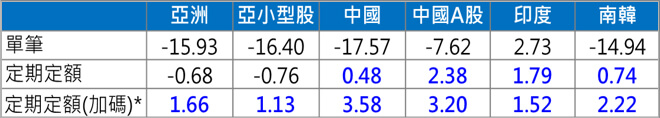 資料來源︰彭博資訊,原幣計價含股利自2022/01/01~2023/03/31,以MSCI亞洲不含日本指數、亞洲不含日本小型企業指數、中國指數與上證綜合指數、印度SENSEX指數、南韓KOSPI指數為準。定期定額假設每月扣款一次於每月1日扣款,為方便計算,遇例假日以前一營業日價格計算。*指2022/09~2022/11三個月每月均加碼一倍扣款。