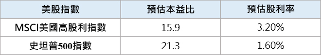 觀察MSCI美國高股利指數,預估本益比僅有15.9倍,較史坦普500指數估值為低;另一方面高股利指數股利率為3.2%,遠優於史坦普500指數的1.6%。