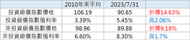 目前投資級債、非投資級債的價格較2010年以來平均值,分別折價14.63%、9.18%;投資級債殖利率則較平均值高出2.06%,非投資級債殖利率較平均值高出1.7%。可以看出現在布局債市,未來有收穫較高資本利得的機會。