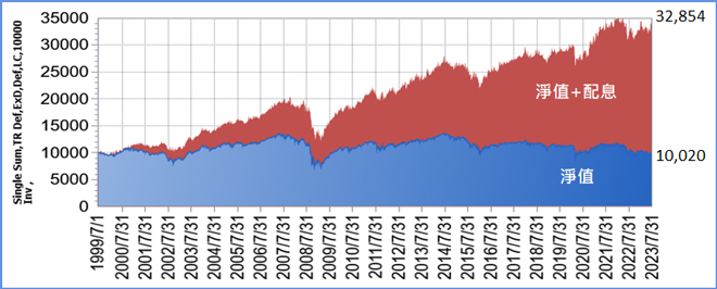 資料來源:理柏資訊、原幣計價,1999/7/1~2023/7/31,期初單筆投資一萬元。基金A股月配息單位成立於1999/7/1。