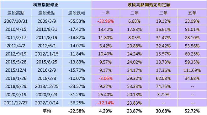 過去15年MSCI世界科技指數約有11波修正,平均跌幅為22.58%,高點入市,持續定期定額一年平均報酬4.29%,二年以上就大幅拉升到23.87%,5年更是有52.72%的好績效!這驗證了即便在科技指數高點入場,只要堅持紀律投資,就有機會獲得良好回報!