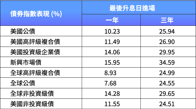 在聯準會最後升息日進場投資債市,由過去經驗, 之後一年、三年均有豐碩的投資成果,主要債市投資三年以上更是有2~3成的報酬率水準。