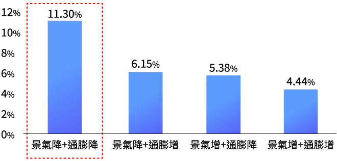 國際貨幣基金(IMF)預估美國2023年經濟成長率將由去年的2.1%降至1.6%;通膨率由8%降至4.5%。根據歷史經驗,在景氣與通膨雙降年度,高評級複合債平均表現優於其他情境。