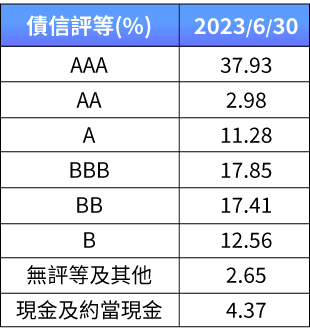 說明:平均債信評等乃依據各持債市值,以簡單加權平均計算投資組合的債信品質。各持債引用不同債信評等機構(標準普爾、穆迪及惠譽)之評等。若三家均有評等取中間級;若兩家有評等取最低級;若只有一家有評等則取該評級;而若均未賦予評級則列入未評等類別。納入計算之資產項目包括債券、信用型衍生性金融商品部位。信用評等由AAA(最高級)~D(最低級)。整體信用評等水準愈低,顯示投資組合之債信風險愈高。